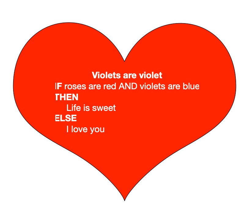 Here is a pseudocode poem based on selection, which is the second core control structure. It chooses between two option based on a boolean test: a true / false question. The question here is: do I love you? Dry run the algorithm or run program to find out.