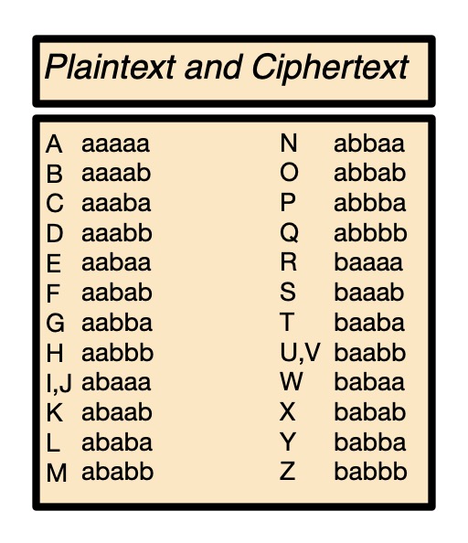 The Tudor and Stuart eras were a time of plot and intrigue. Perhaps the most famous is the 1605 Gunpowder plot where Guy Fawkes tried to assassinate King James I by blowing up the Houses of Parliament. Secrets mattered! In his youth Bacon had worked as a secret agent for Elizabeth I’s spy chief, Walsingham, so knew all about ciphers. Not content with using those that existed he invented his own. The one he is best remembered for was actually both a cipher and a form of steganography. While a cipher aims to make a message unreadable, steganography is the science of secret writing: disguising messages so no one but the recipient knows there is a message there at all.