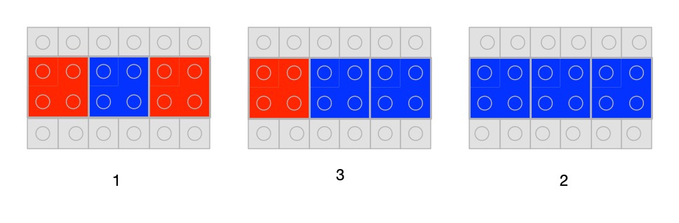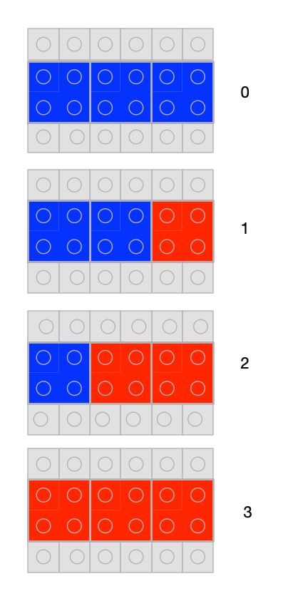 This is actually just a variation of unary, that we have seen earlier, just with a fixed amount of storage. It isn’t a very good representation as you need lots of storage space to represent large numbers because it is not using all possible combinations of the two symbols. In particular, far more numbers can be represented with a better representation. In the above example, 3 places are available on the lego base to put the blocks we are using and we have been able to represent 4 different numbers (0 to 3). However, information theory tells us we should be able to store up to 8 different numbers in the space, given two symbols and using them the right way, with the right representation.