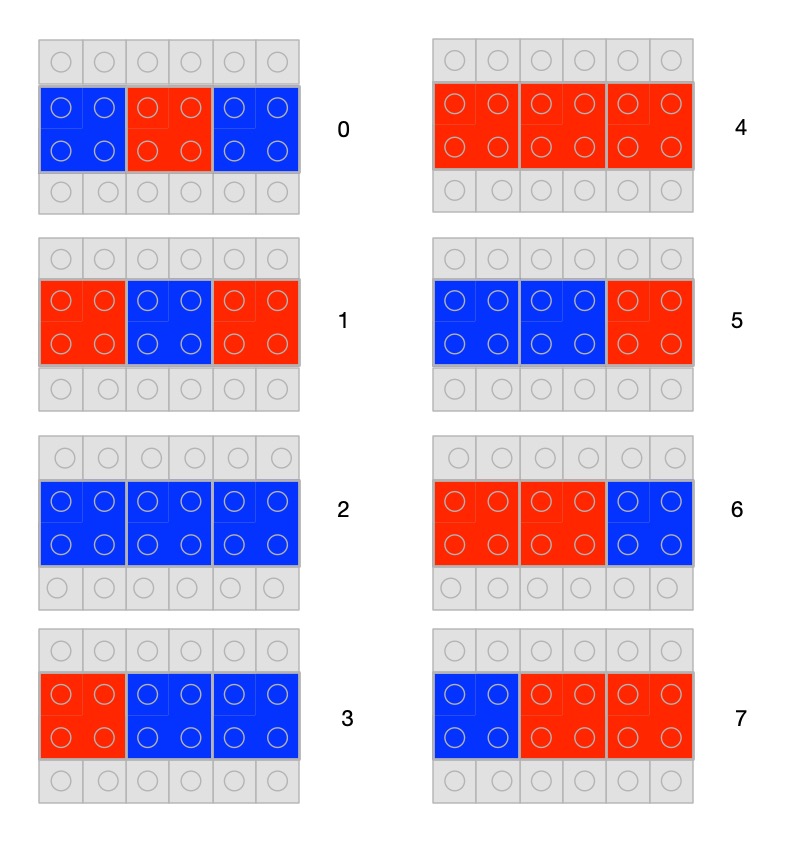 Also called a a reflected binary code, Gray code is a sequence where you change only one bit (so the colour of one lego block) at a time as you move to the next number.