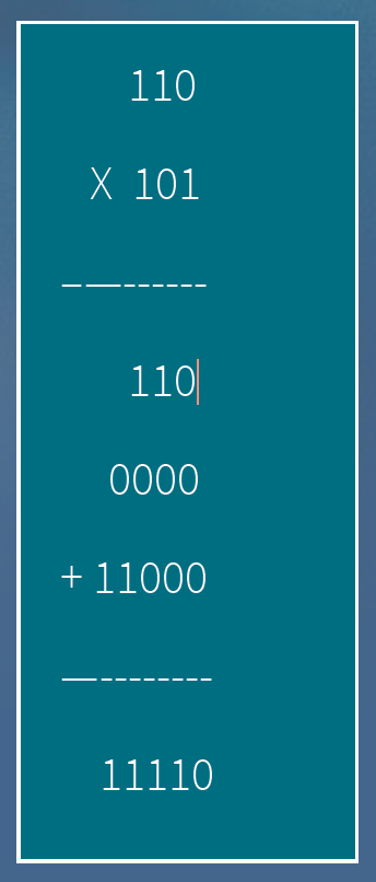 To multiply 110 by 101, you multiply 110 by each digit of 101 in turn. This just involves shifts, and then discarding or keeping numbers. First multiply 110 by 1 (the ones digit of 101) giving 110. Write it down. Now shift 110 one place to give 1100 and multiply by 0 (the twos digit of 101). This just gives 0000. Write it below the previous number. Shift 110 by another place to give 11000. Multiply it by 1 (the fours digit of 101). That gives 11000. Write it down below the others. Add all three numbers to get the answer (see box).