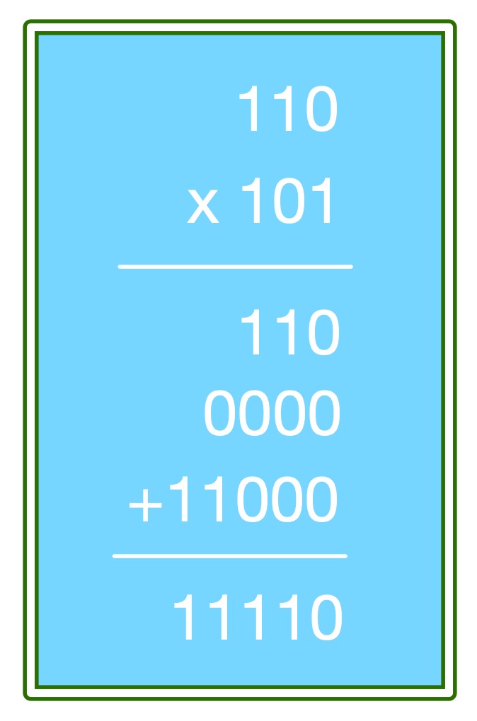 To multiply 110 by 101, you multiply 110 by each digit of 101 in turn. This just involves shifts, and then discarding or keeping numbers. First multiply 110 by 1 (the ones digit of 101) giving 110. Write it down. Now shift 110 one place to give 1100 and multiply by 0 (the twos digit of 101). This just gives 0000. Write it below the previous number. Shift 110 by another place to give 11000. Multiply it by 1 (the fours digit of 101). That gives 11000. Write it down below the others. Add all three numbers to get the answer (see box).