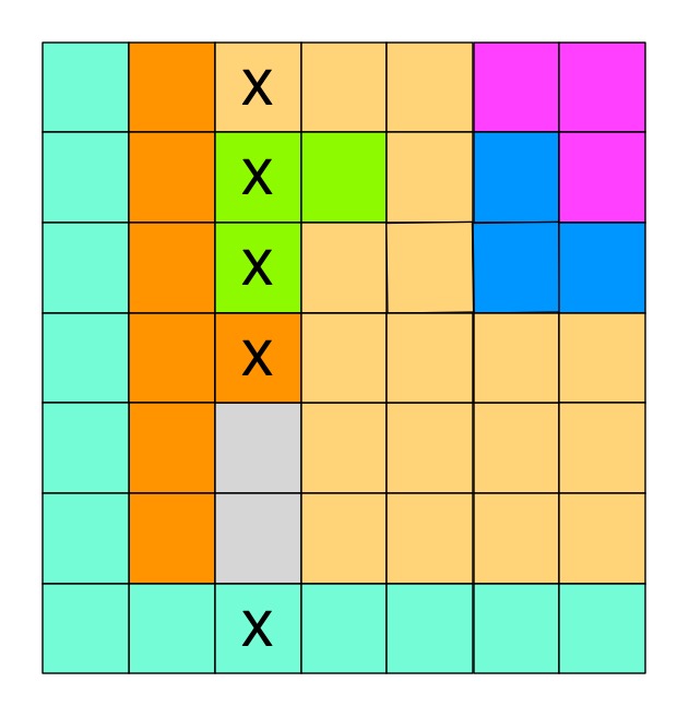 Where to start? Well notice the grey territory near the bottom. It is a territory that lives totally in one column. If we go to the rules of Queens we know that there must be a Queen in this territory. That means that Queen must be in that column. We also know that only one Queen can be in a column. That means none of the other territories in that column can possibly hold a Queen there. We can cross them all out as shown.