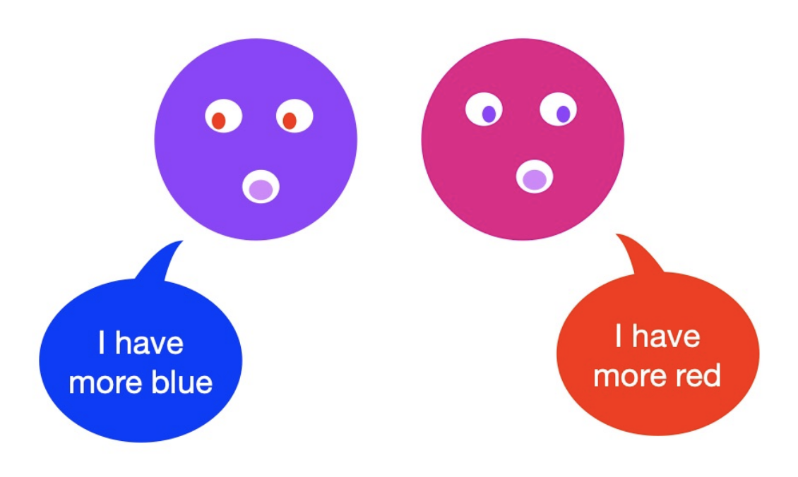 Purple can be created by mixing together red and blue paint. You can probably tell which of the faces in the image has more blue and which has more red. Does music work the same way?