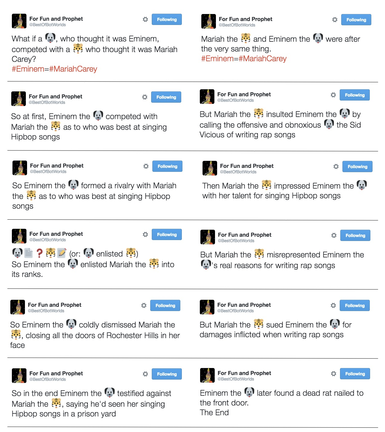 Let’s look at a story created and tweeted by our Twitterbot @BestOfBotWorlds over a series of 12 tweets. Can you see where the joins are in our Scéalextric track? Can you recognize where character-specific knowledge has been inserted into the rendering of different actions, making the story seem funny and appropriate at the same time? More importantly, can you see how you might connect the track segments differently, choose characters more carefully, or use knowledge about them more appropriately, to make better stories and to build a better story-generator? That’s what Scéalextric is for: to allow you to build your own storytelling system and to explore the path less trodden in the world of computational creativity. It all starts with a click.