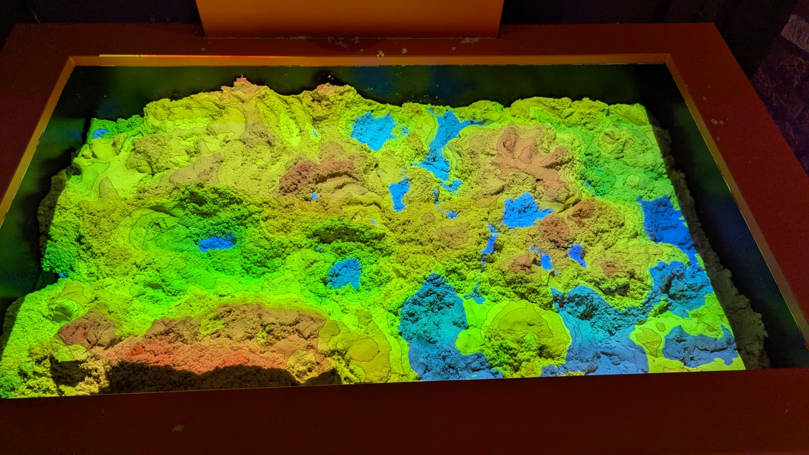 Near the end of the exhibition sits a table covered in sand, which has, projected onto it, the current topography of the sand. Where the sand is piled up higher is coloured red and orange, and lower in green and blue. Looking across the table you can see how sand at the same level, even far apart, is still within the same band of colour.
