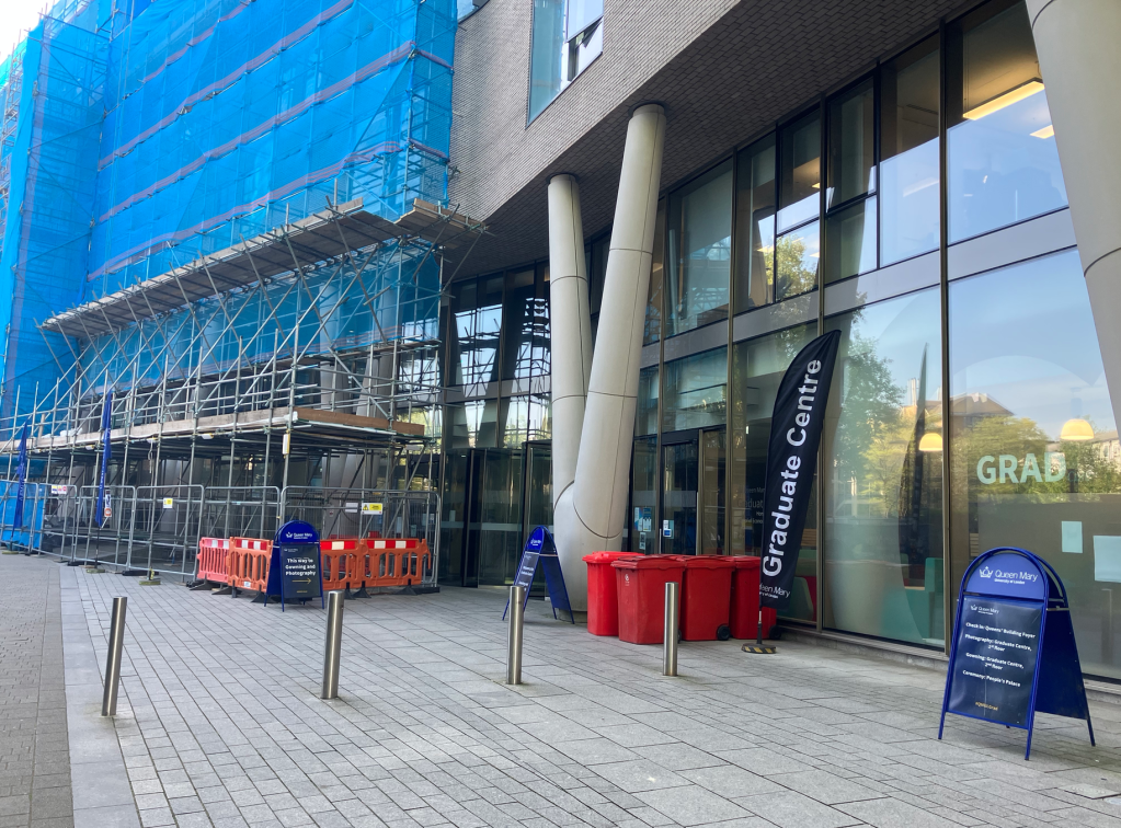- Keep walking up Mile End Road, turn left into Bancroft Road (you will walk under a stone bridge announcing the Faculty of Engineering, keep going. You will soon pass the Infusion shop on the left. The Graduate Centre is the large glass building on the right. Don’t go any further than the green and black panelled building (G.E. Fogg) which spans the road.