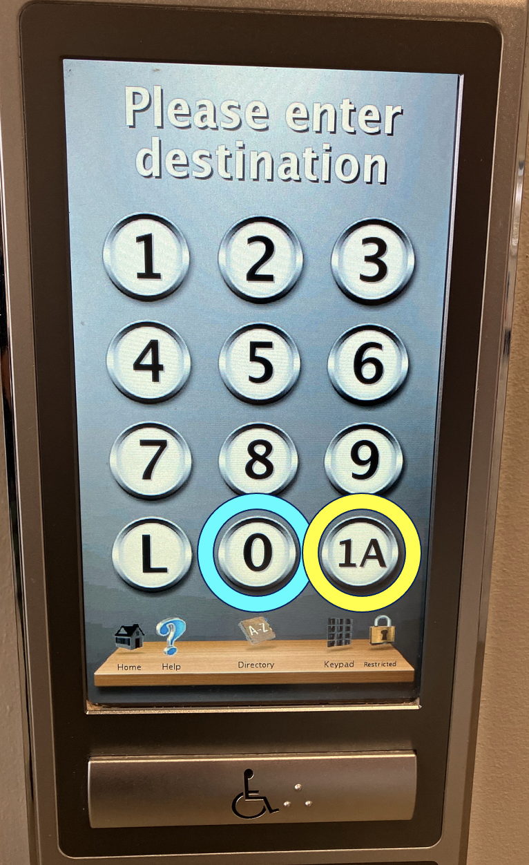 Select 1A (this is the mezzanine floor between ground and 1) on the keypads next to the lifts. It will direct you to lift L2 (the middle lift) and the exit will be the opposite set of doors from the ones you go in. Exit at 1A and follow the route which will be signposted and doors open. When returning back to the ground floor use the 0 button to call the lift.