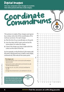 Primary Puzzles 2 Screenshot A booklet of puzzles with links to computing Download Primary Puzzle Book 2. Solutions are found below (in progress) UK Schools order print copies of our magazines and booklets here (while stocks last). You can also print certificates to award to your class or home-educated child. Solutions Download all the solutions as a single zip file: Primary Puzzles – Issue 2 solutions [ZIP] Spot the Difference – Page 1 Spot 5 differences Click here for the solution to the cover page spot the difference. Egyptian Survey Puzzle – Page 2 Click here for the solution to the Egyptian survey puzzle. Egyptian Survey Puzzle – Page 3 Click here for the solution to the Egyptian survey puzzle. Spot the Difference – Page 4 Spot 5 differences Click here for the solution to the spot the difference. Scratch Puzzle – Page 5 Click here for the solution to the scratch puzzle. Coordinate Conundrum – Page 6 Click here for the solution to the coordinate conundrum. Coordinate Conundrum – Page 7 Click here for the solution to the coordinate conundrum. Pixel Puzzle – Page 8 Click here for the solution to the pixel puzzle. Run length Encoding Pixel Puzzle – Page 9 Click here for the solution to the run-length encoding pixel puzzle. Compression Puzzle – Page 10 Click here for the solution to the compression puzzle. Artist Word Search – Page 11 Click here for the solution to the Artist Word Search. Spot the Difference – Page 12 Click here for the solution to the Romans Kriss Kross. This blog is funded by EPSRC on grant EP/W033615/1. Share this: Click to share on Tumblr (Opens in new window) Tumblr Click to email a link to a friend (Opens in new window) Email Click to share on X (Opens in new window) X Click to share on Facebook (Opens in new window) Facebook Like Loading...