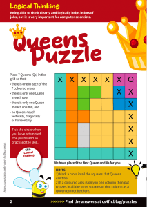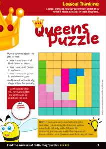 Primary Puzzles 3 A booklet of puzzles with links to computing Download Primary Puzzle Book 3 Solutions are given below. UK Schools order print copies of our magazines and booklets here (while stocks last). You can also print certificates to award to your class or home-educated child. Find more puzzles including our other puzzle books here. Solutions Download all the solutions as a single zip file: Primary Puzzles – Issue 3 solutions [ZIP] Match the Silhouette – Page 1 Click here for the solution to the cover page silhouette matching puzzle. Queens Puzzle – Page 2 Click here for the solution to this Queens puzzle. Queens Puzzle – Page 3 Click here for the solution to this Queens puzzle. Match the Silhouette – Page 4 Spot 5 differences Click here for the solution to the silhouette matching puzzle. Logic Puzzle – Page 5 Click here for the solution to the logic puzzle. The Tour Guide – Page 6 Click here for the solution to the tour guide puzzle. The Knight’s Tour – Page 7 Click here for the solution to the Knights Tour. Swap Puzzle – Page 8,9 Click here for the solution to the swap puzzle. Silly Syllogisms – Page 10,11 Click here for the solution to the Silly Syllogisms. Doodle Algorithm – Page 12 Click here for a solution to the Doodle algorithm. This blog is funded by EPSRC on grant EP/W033615/1. Share this: Click to share on Tumblr (Opens in new window) Tumblr Click to email a link to a friend (Opens in new window) Email Click to share on X (Opens in new window) X Click to share on Facebook (Opens in new window) Facebook Like Loading...