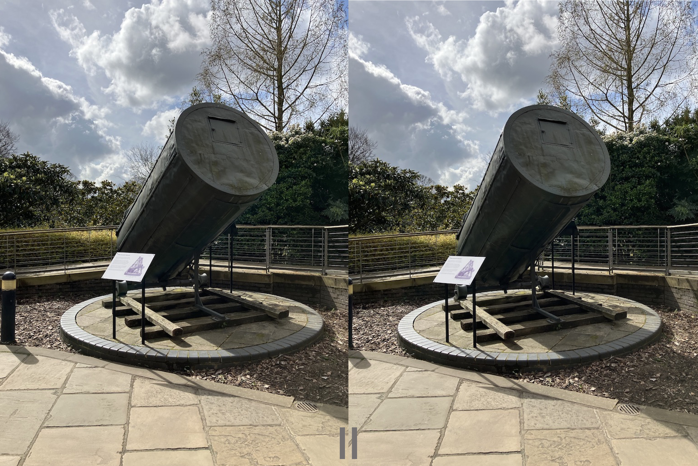 Look in the middle between the two photos above (of William Herschel’s telescope at the Greenwich Observatory, London). Relax your eyes’ focus and your brain will try and combine the two images into a single one. Once that happens you’ll see three photos. The middle one (which exists only in your brain!) gives an impression of depth perception / 3D. It’s quite a nice effect but note that not everyone is able to see this. It does depend on your eyes, brain and your eyesight.