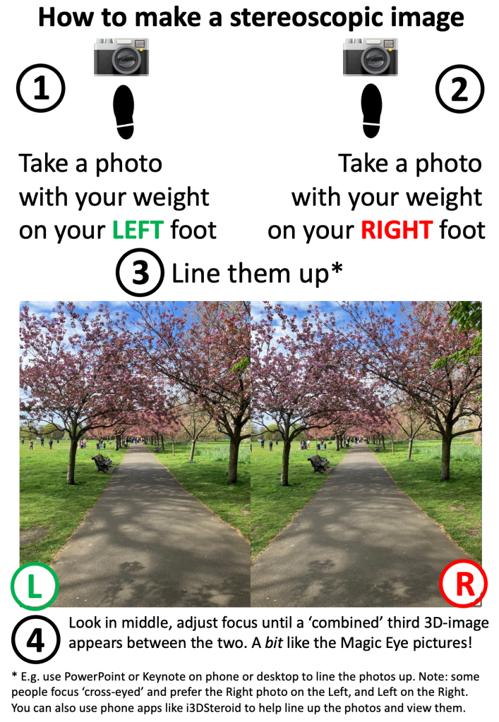 The basic instructions are simple – just take two photos a few inches apart (by holding the camera firmly and moving it with your body first to the left [take photo] and then to the right [take photo]. Line the two photos up in whatever way suits you and gaze between them until the 3D effect appears.